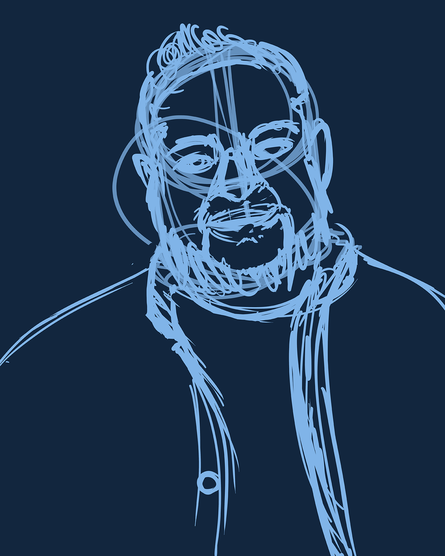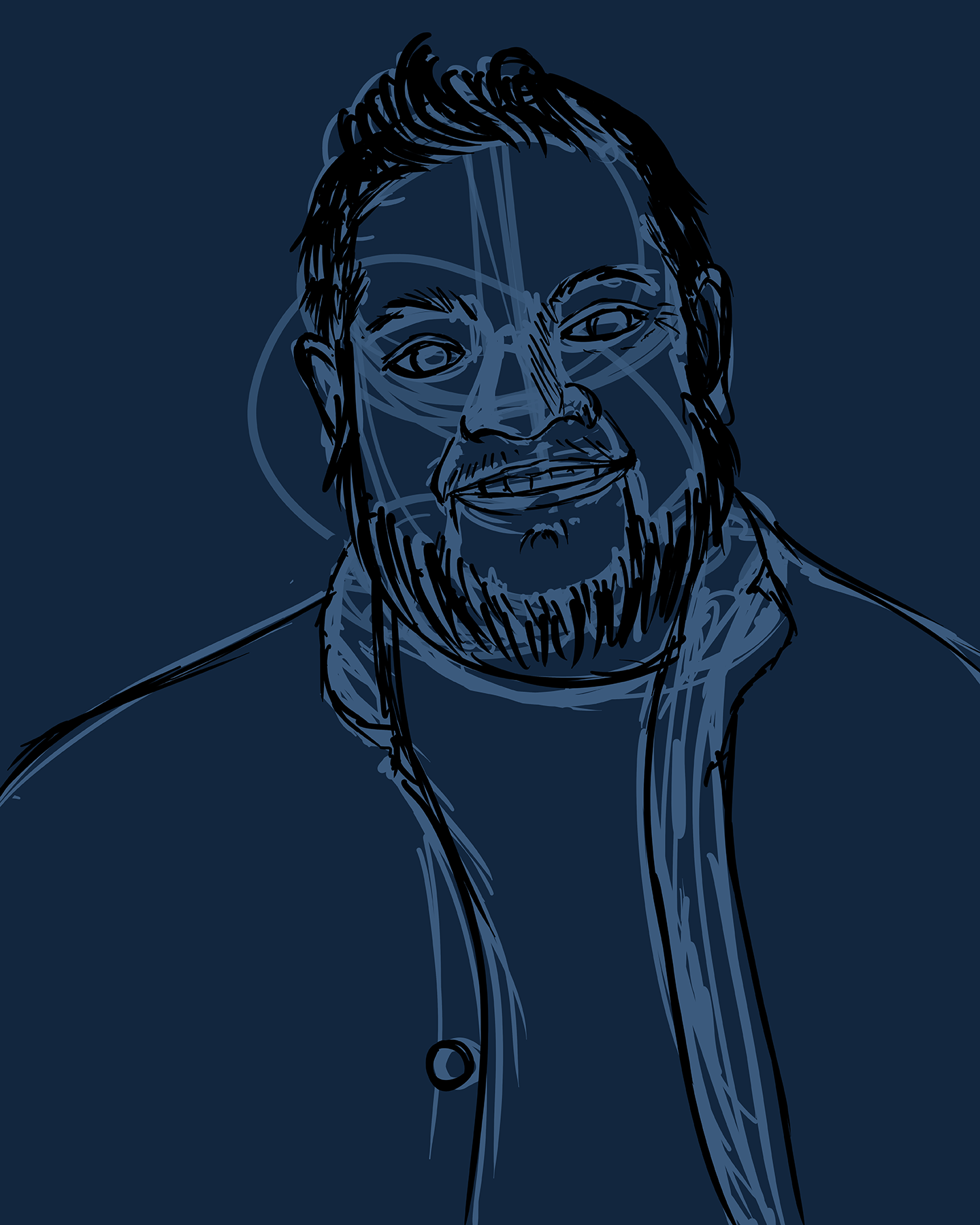 Here is another process abomination as I am focusing on blocking out and light values to solidify the form. This step still uses the lines as guides before I finally step away from them to actually start painting.
